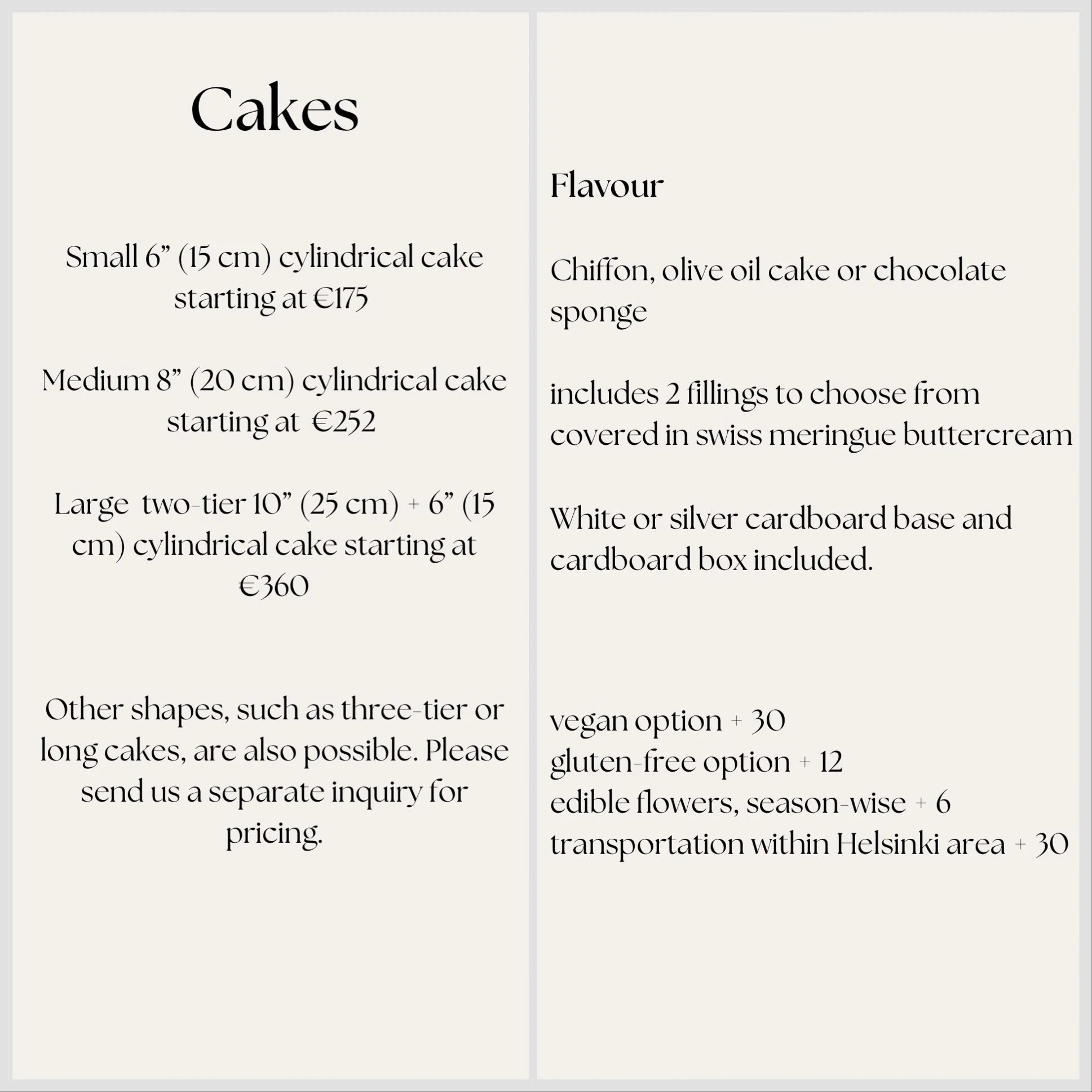 Alejandra offers the following cake options: